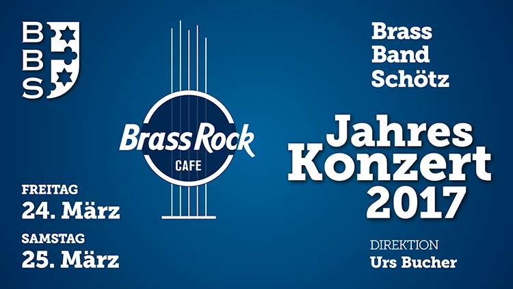 Die Brass Band Schötz ‐ unter der Leitung von Urs Bucher ‐ freut sich, Sie am 24. und 25. März zu unserem alljährlichen Jahreskonzert einzuladen. Im ersten Konzertteil bieten wir Ihnen wiederum bunt gemischte Werke: Vom furiosen Werk 'Lord of all' bis hin zum lieblichen Posaunen-Solo 'Amarte es un placer' gespielt von Thomas Kurmann. Zur Eröffnung unseres neuen „Brass Rock Cafe's” haben wir für den zweiten Konzertteil keine Kosten gescheut und verschiedene Prominente aus dem Musikbusiness eingeladen. Zudem konnten wir Stefan Schärli für die Moderation gewinnen. Er wird die Stars in Empfang nehmen und Ihnen entsprechende Informationen zur Entstehung des Cafes liefern. Nach dem Konzert mit uns im neu eröffneten „Brass Rock Cafe” anzustossen.