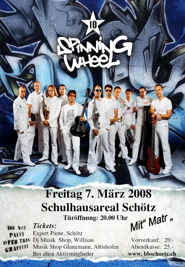 Am Freitag den 7. März. 2008 um 20.00 Uhr öffnen sich im Schulhausareal Schötz die Türen für die bekannte Live Band "Spinning Wheel". Diese Live Band wurde 1992 gegründet. Was früher eine drei Mann Band war, entwickelte sich zu einer zehn Mann Band. Fünf Bläser, Piano, Gitarre, Bass, Schlagzeug und Perkussion präsentieren heute den brazzFunk. Diese Mischung aus Brass, Jazz, Funk, Rock und Latin Musik begeistert garantiert Jung und Alt.