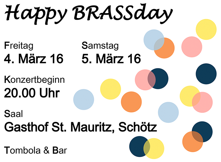 Die Brass Band Schötz - unter der neuen Leitung von Urs Bucher - freut sich, Sie am 4. und 5. März zu unserem alljährlichen Jahreskonzert einzuladen. Unter dem Motto 'Happy BRASSday' feiern wir unser 10-jähriges Bestehen - feiern Sie mit! Das abwechslungsreiche Konzert bietet wiederum für jeden Geschmack etwas: Vom imposanten Werk 'Harmony Festival' von Jan de Haan (Selbstwahlstück für das kommende Eidgenössische Musikfest in Montreux) zur romantischen Ballade, von Rock/Pop bis hin zum Volkstümlichen. Zudem haben Sie wieder die Gelegenheit, tolle Tombola-Preise zu gewinnen und nach dem Konzert mit uns in der berüchtigten Musikbar auf unser Jubiläum anzustossen. Prost!